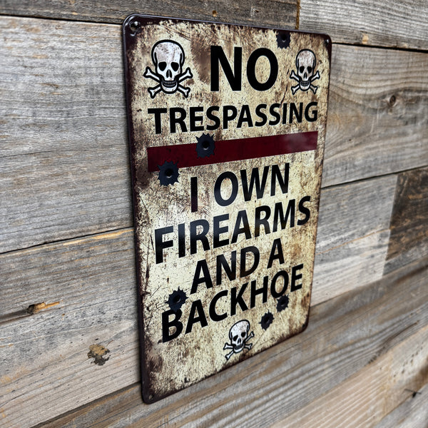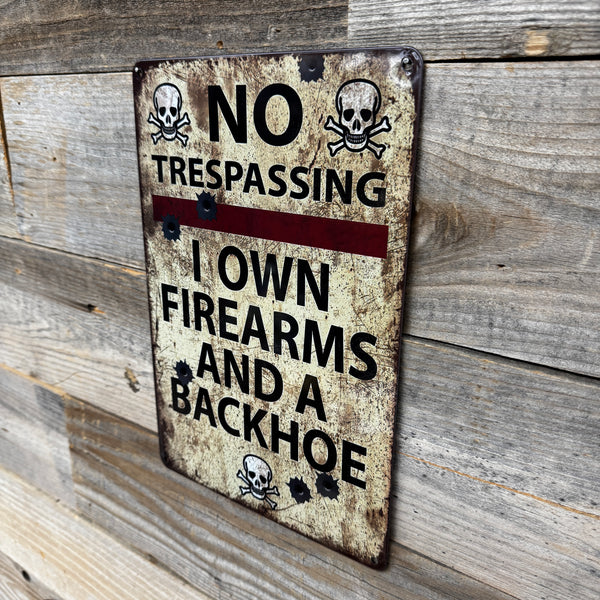 “No Trespassing – I Own Firearms and a Backhoe” Metal Sign