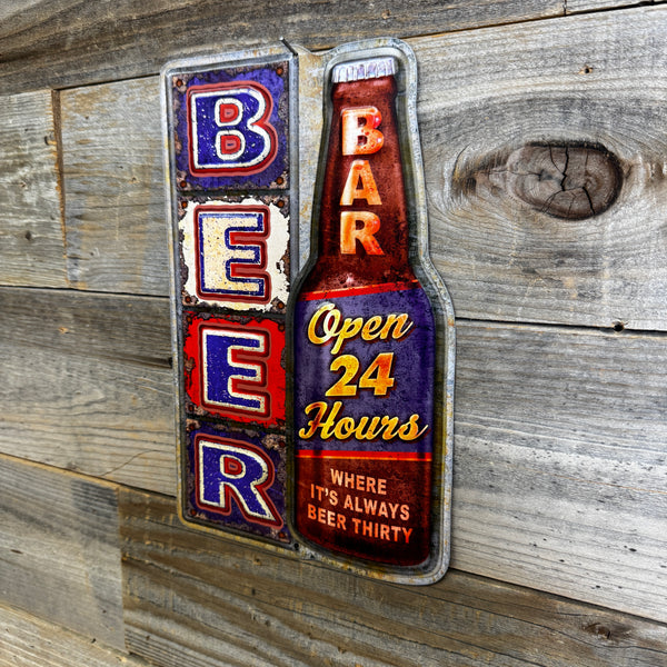 Shaped Embossed “Open 24 Hours” Beer Bar Metal Wall Sign – Bottle Design | Man Cave & Bar Decor