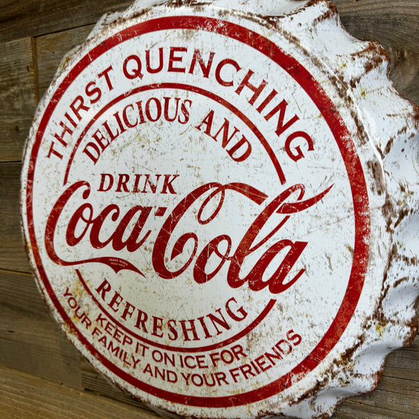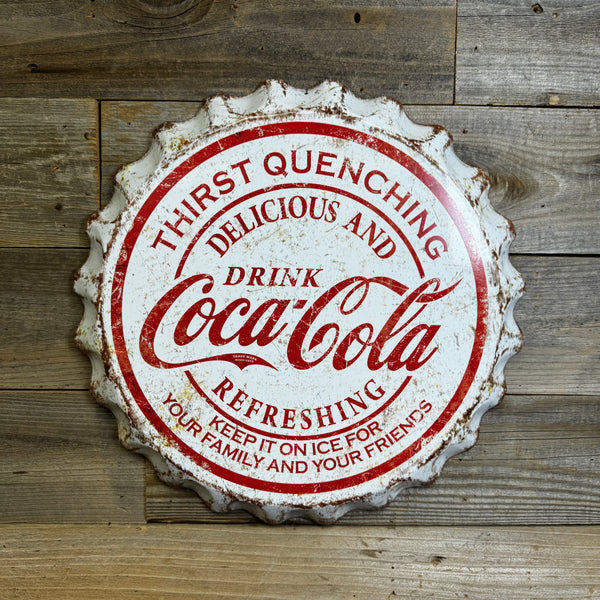 Bring retro charm to your space with this Weathered White Coca-Cola Bottle Cap Sign a striking piece of Americana! Crafted from heavy duty metal with a domed face and scalloped edges, this 17” round sign is perfect for man caves, garages, kitchens, game rooms, or bars.