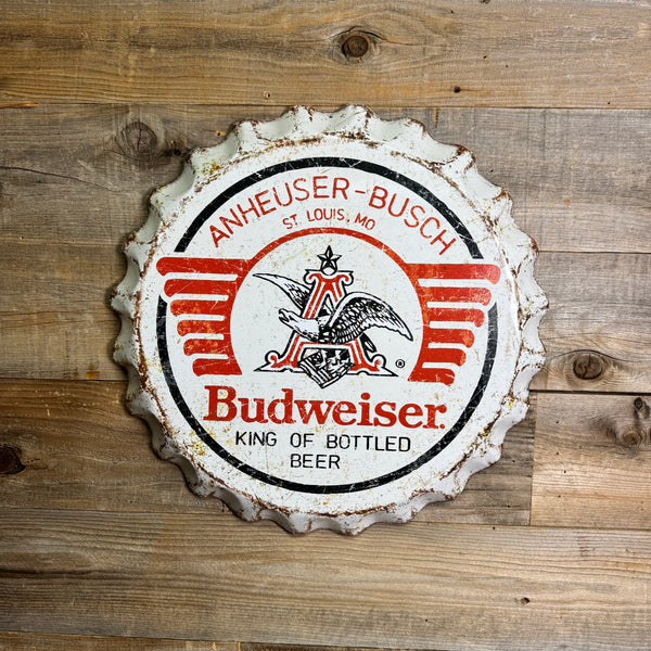 Vintage Budweiser Bottle Cap Metal Wall Sign – 17” Retro Beer Bar Decor