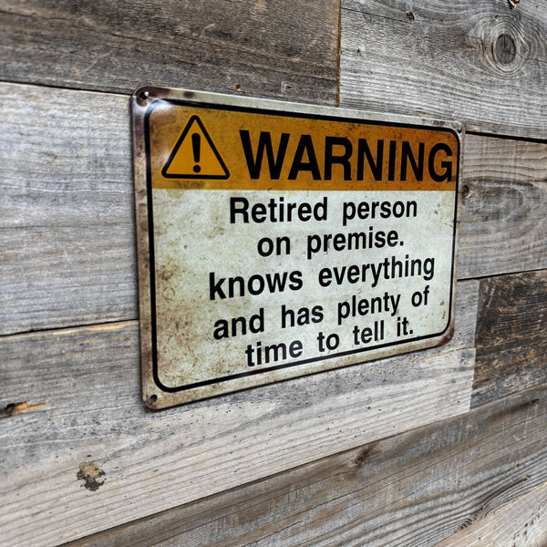 Warning: Retired Person On Premises – Knows Everything and Has Time to Tell It Metal Sign